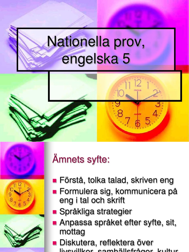 Skolverket återanvänder hela eller delar av proven under flera års tid. Här ges exempel på olika typer av uppgifter som kan förekomma i nationella prov i Engelska 5 i gymnasieskolan. Engelska 6 - Gymnasiet Undermeny för Engelska 6 - Gymnasiet.